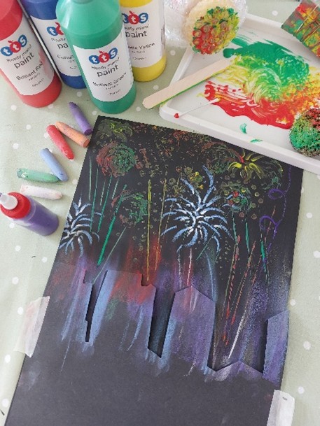 Using more ready mixed paint experiment with a range of materials to print/draw patterns in the sky to look like exploding fireworks e.g. cotton buds, pan scourers, bubble wrap, sponges etc.