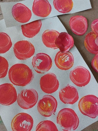 To make the poppies, add red and yellow ready mixed paint to a shallow inking tray. Use something with a round base to print flower/petal shapes (eg. recycled pots, paint pots etc – I’ve used the base of a small foil tin). Press into the paint and ‘twist’ to slightly mix the colours for a more interesting print. Lift and print onto the paper. Repeat and cover the sheet (you need approx. 7 circles per wreath for this craft project but make more and you can use for other Remembrance activities). Leave to dry.