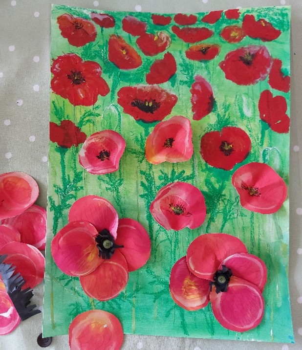 Treat the picture as 2 halves – the top will be 2D, the bottom of the picture will have some 3D elements. Starting from the top, use red/orange/yellow paint sticks to draw poppy flowers onto half of the picture.